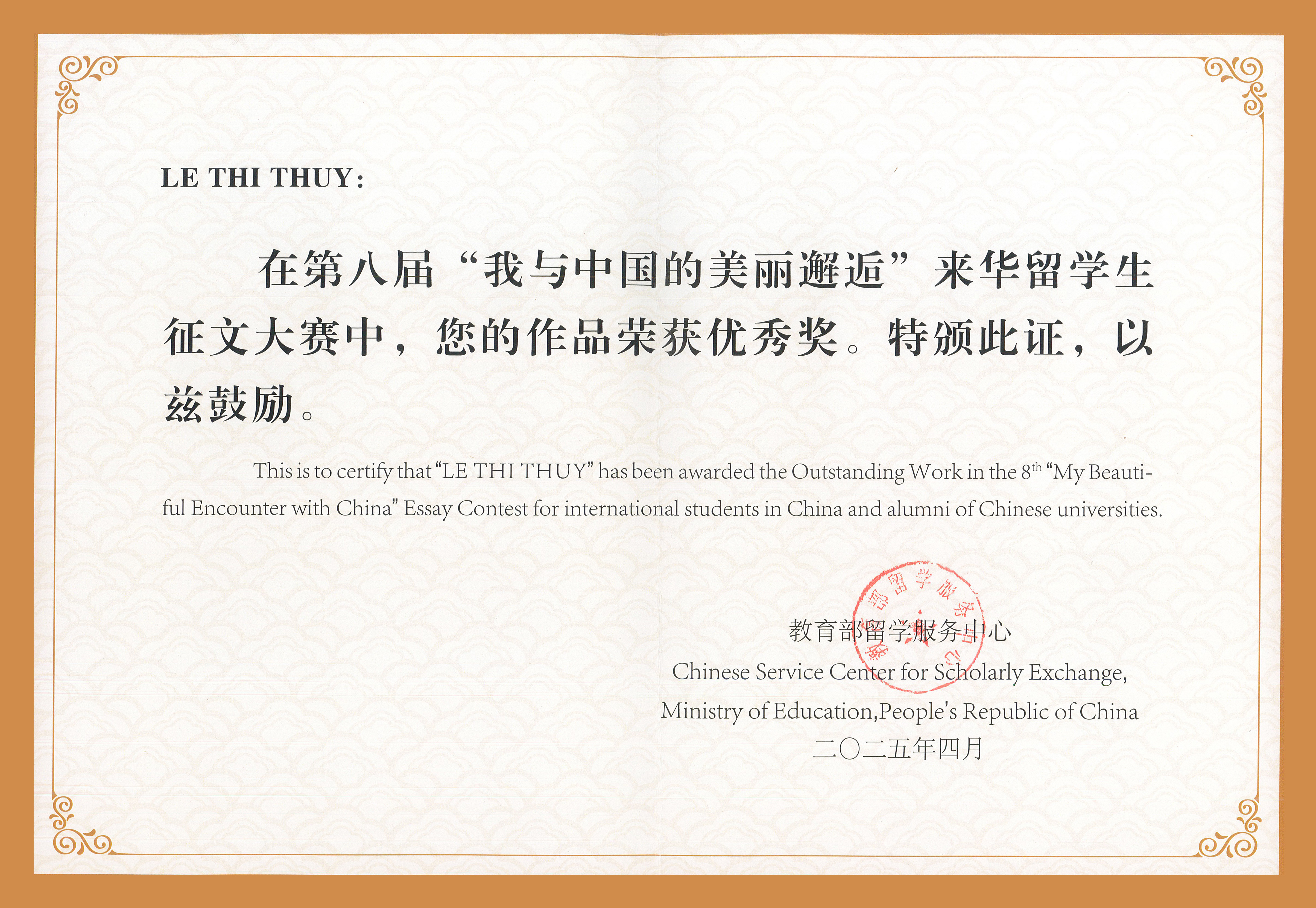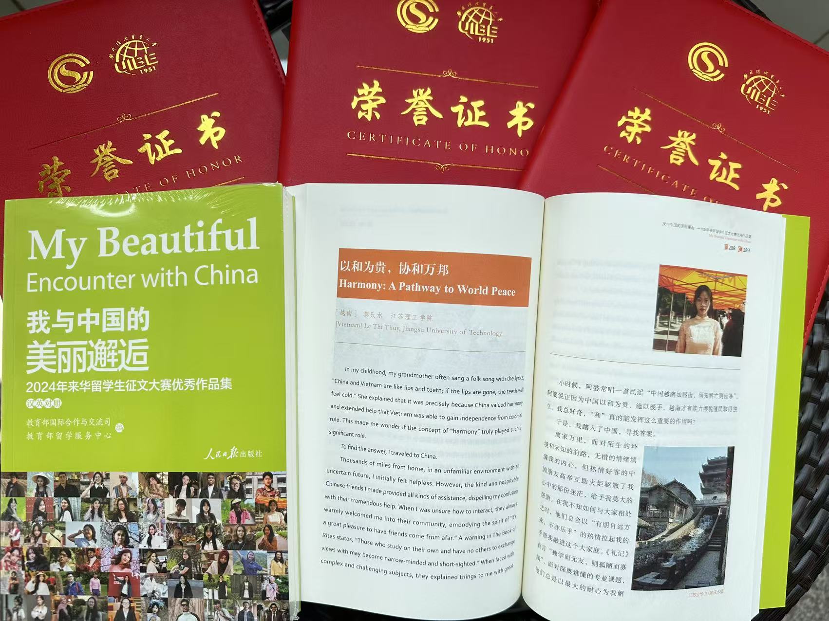 我院越南籍留学生LE THI THUY脱颖而出,获得征文优秀奖,其作品《以和为贵,协和万邦》被收录在由人民日报出版社出版的《我与中国的美丽邂逅——2024年来华留学生征文大赛优秀作品集》中。我校荣获“院校优秀组织奖”,教师郜思洁获“优秀指导教师称号”。