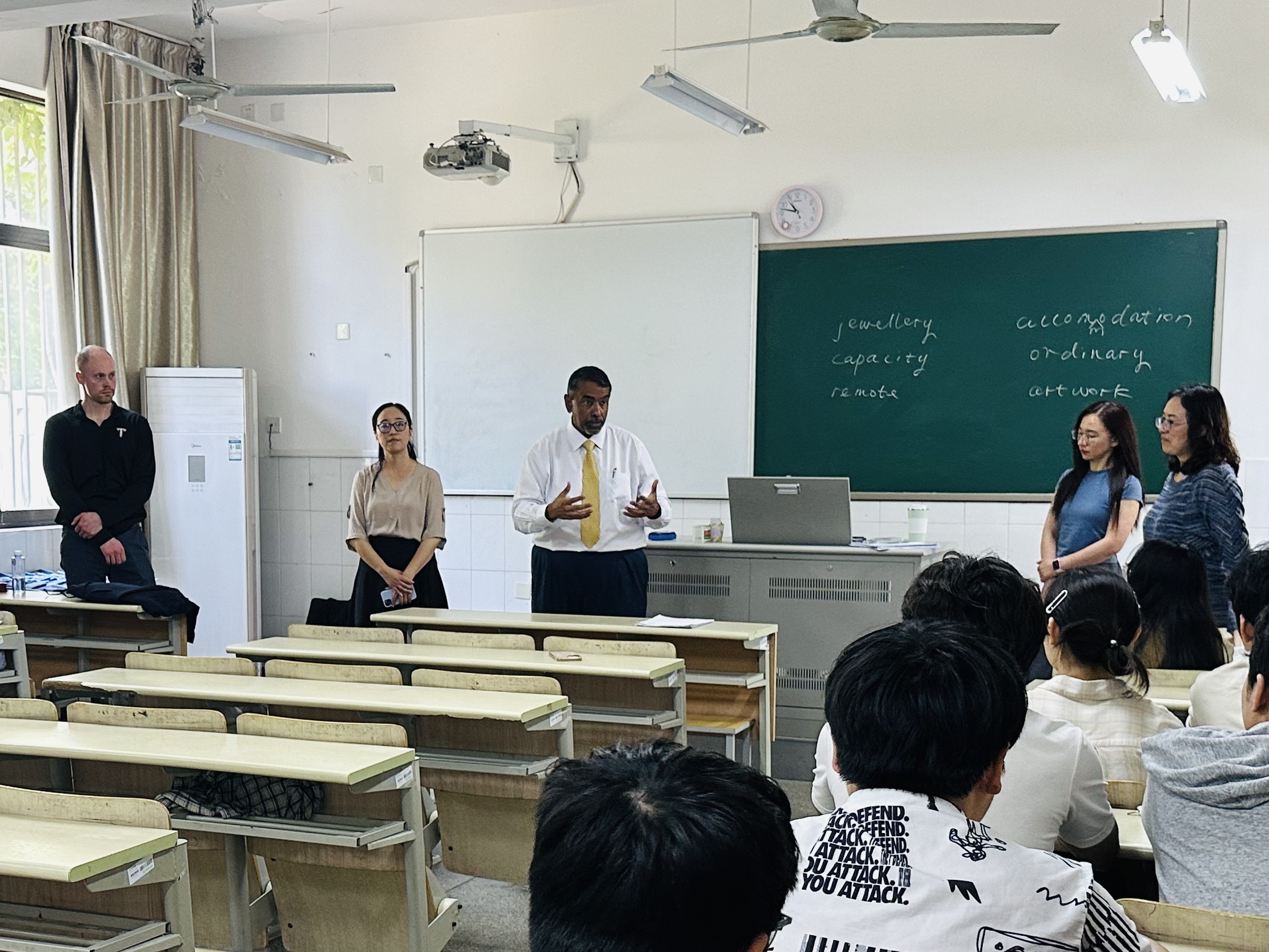会谈结束后,Sohail Agboatwala一行还专程走进24中美金融班的英语课堂,与即将赴美的项目学生进行了友好互动和交流,就学生的英语学习和赴美准备工作等给出提示和建议。(图/周雅倩;文/姜捷;审核/于琴妹)