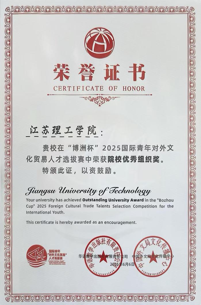 6月6日,由华语教学出版社、中国外文局文化传播中心主办,北京华语时代文化传媒有限公司、浙江工业大学和宁波博洲照明有限公司共同承办的“博洲杯”2025国际青年对外文化贸易人才选拔赛颁奖典礼于杭州市举行。我院印度尼西亚籍留学生MICHAEL HARTONO(黄家豪)的作品《我眼中的诗意中国》和BRYAN EDWARD TJIE(齐百仁)的作品《武缘——走向梦想的路》脱颖而出,斩获文化推广贡献奖。我校荣获“院校优秀组织奖”,教师郜思洁获“优秀指导教师奖”。