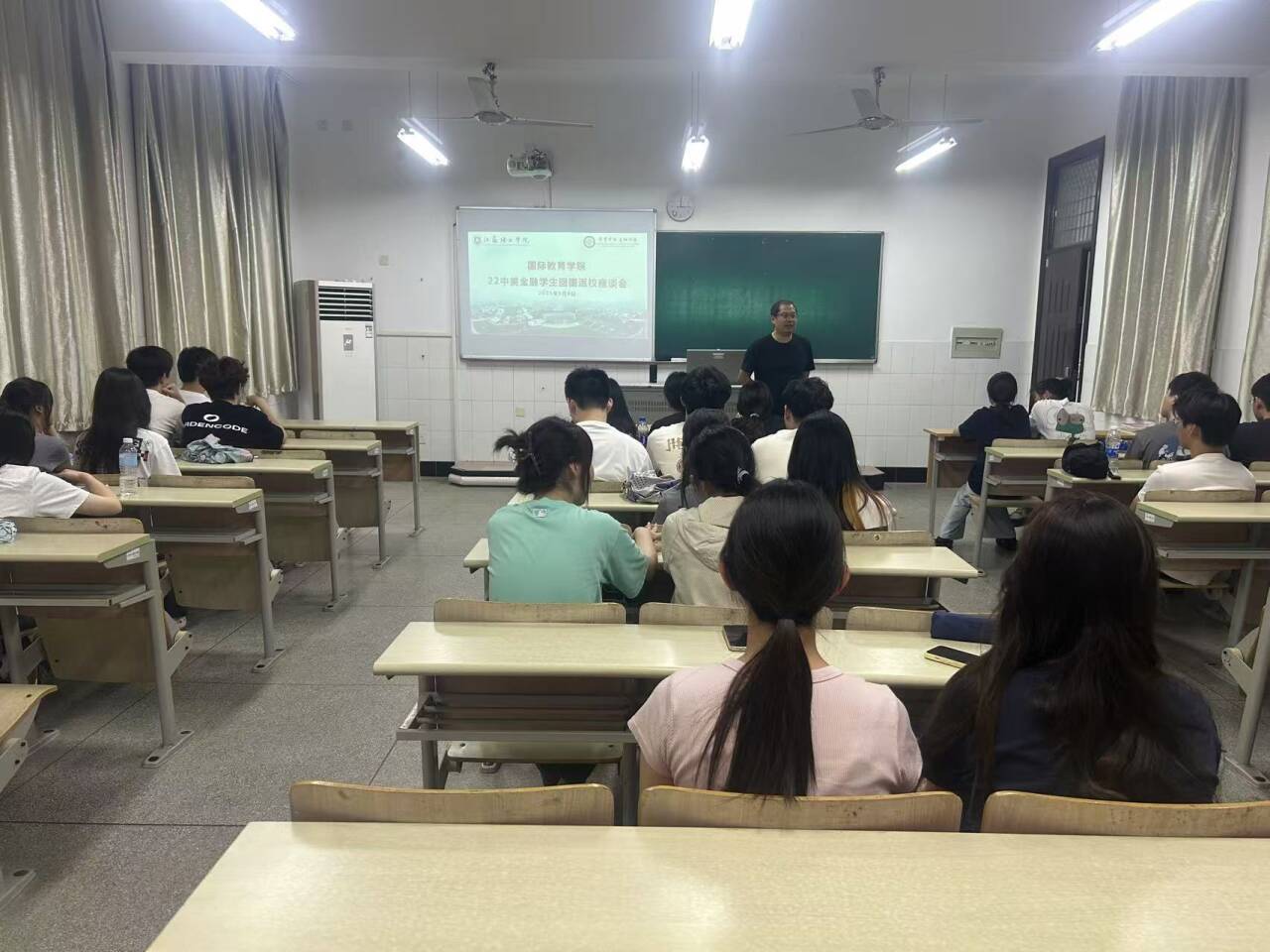 张扬围绕复学安排及本学年的教学计划为同学们作了详细说明,重点介绍了课程衔接、学分认定、毕业要求等事项,鼓励大家以积极向上的状态投入新的学习阶段,扎实完成国内剩余学业。