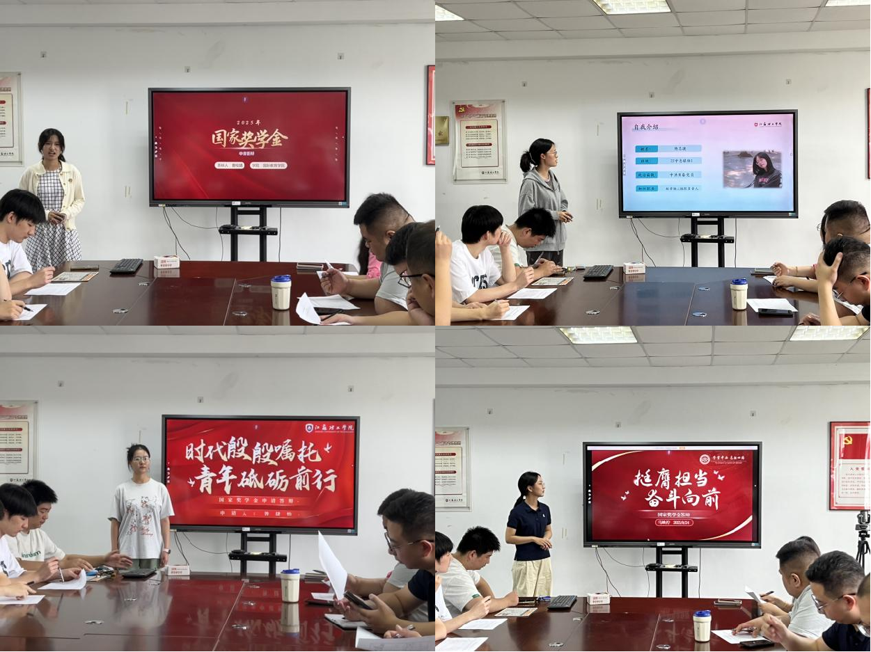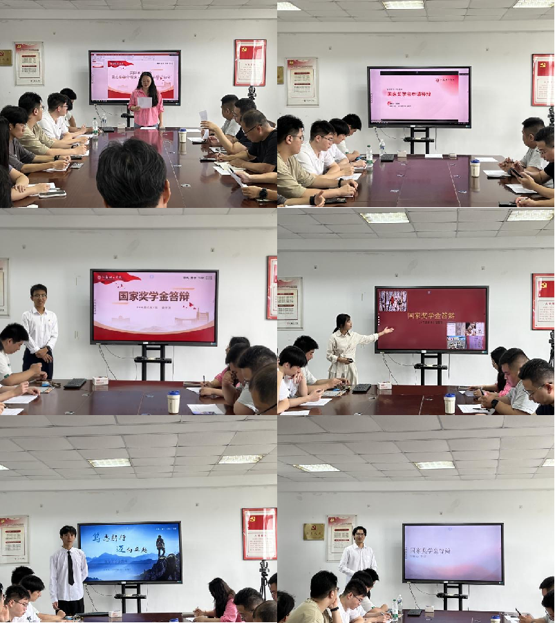 2025年9月24日中午,我院在52号楼201会议室举行2025年国家奖学金候选人风采展示暨答辩评审会。本次会议由学院党委副书记、副院长蒋詹,留学生管理办公室主任唐子俊,辅导员、班主任、学生代表等组成评审团,会议由辅导员张梦灵主持。